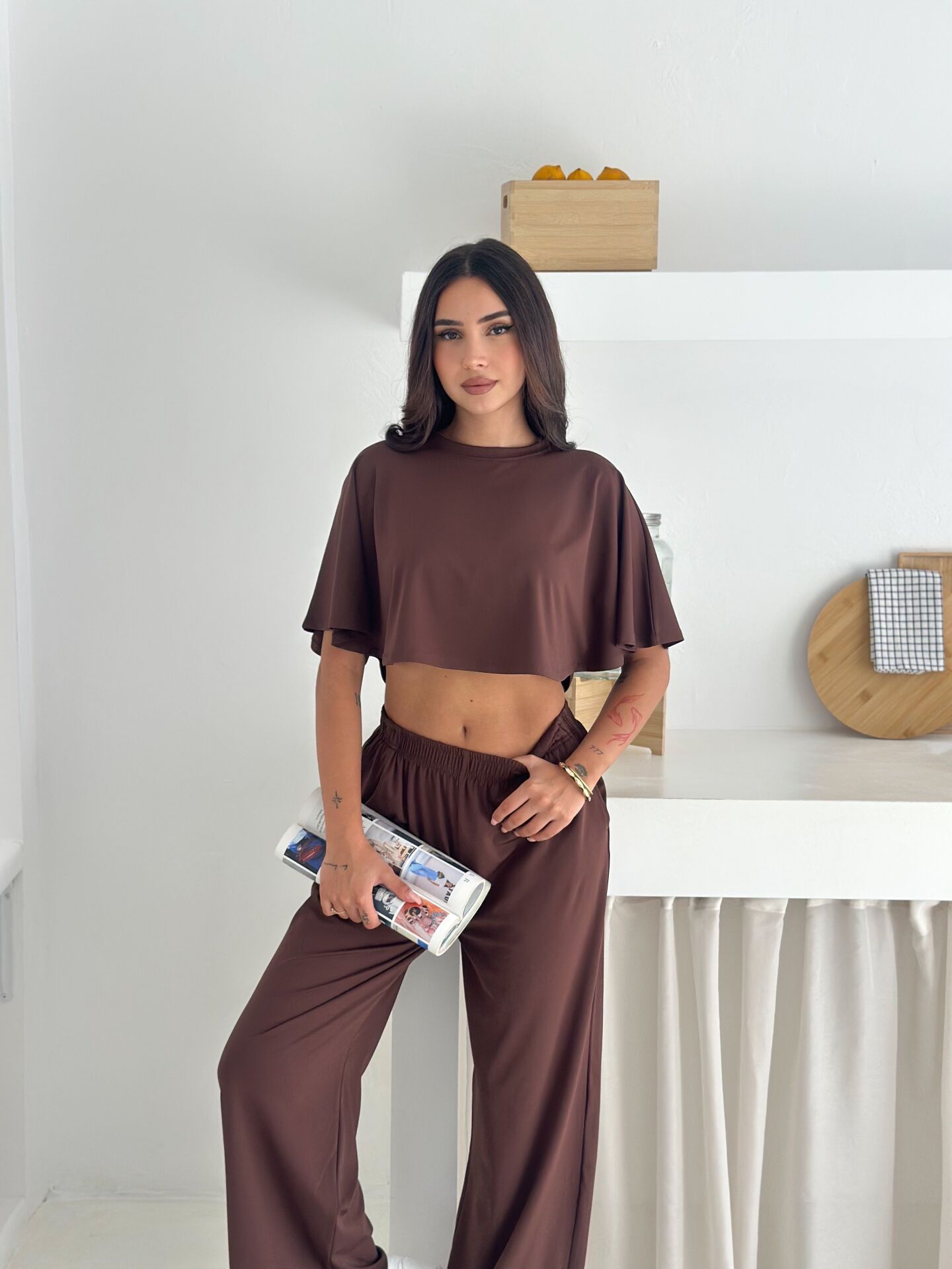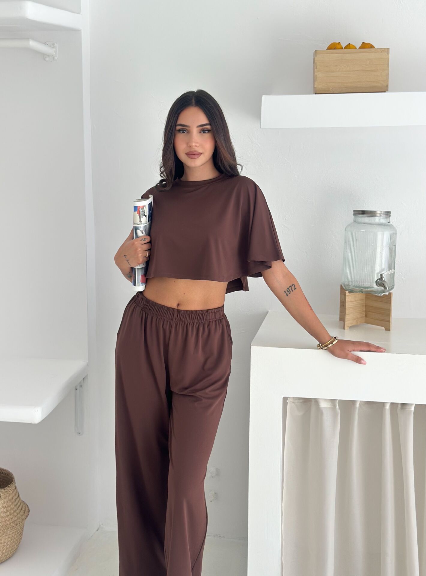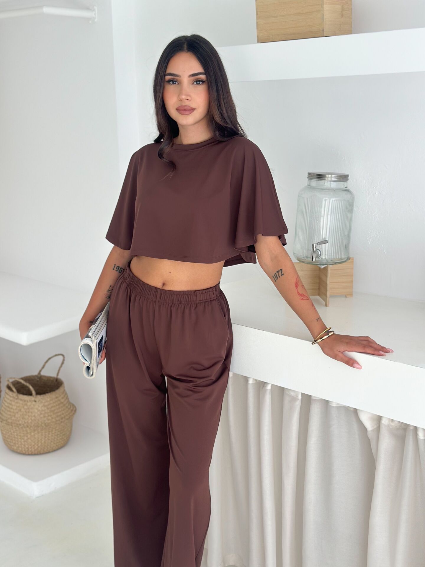 Yumuşacık dokulu ve likralı kadın günlük takım, yaz sıcaklarında maksimum konfor sunmak için tasarlanmıştır. Üst parçası yarasa kol geniş bluzdan, alt parçası ise cepli baggy kesim pantolondan oluşur. %90 Polyester – %10 Likra karışımı kumaşı sayesinde esnek, hafif ve ferah bir kullanım sağlar. Geniş paça formu modern bir siluet sunarken bisiklet yaka detayı sade ve şık bir görünüm oluşturur. Astarsız ve baskısız yapısı sayesinde günlük kullanım için ideal olup Cool & Comfort persona ruhunu yansıtır. Kemersiz yapısı rahatlığı artırır; yüksek beli ile duruşu toparlayarak zarif bir görünüm sunar. Tek parça paket içeriği sayesinde pratik bir alışveriş deneyimi sağlar. Yaz sezonuna özel renk ve dokularla Winmoda tarafından üretilmiştir.