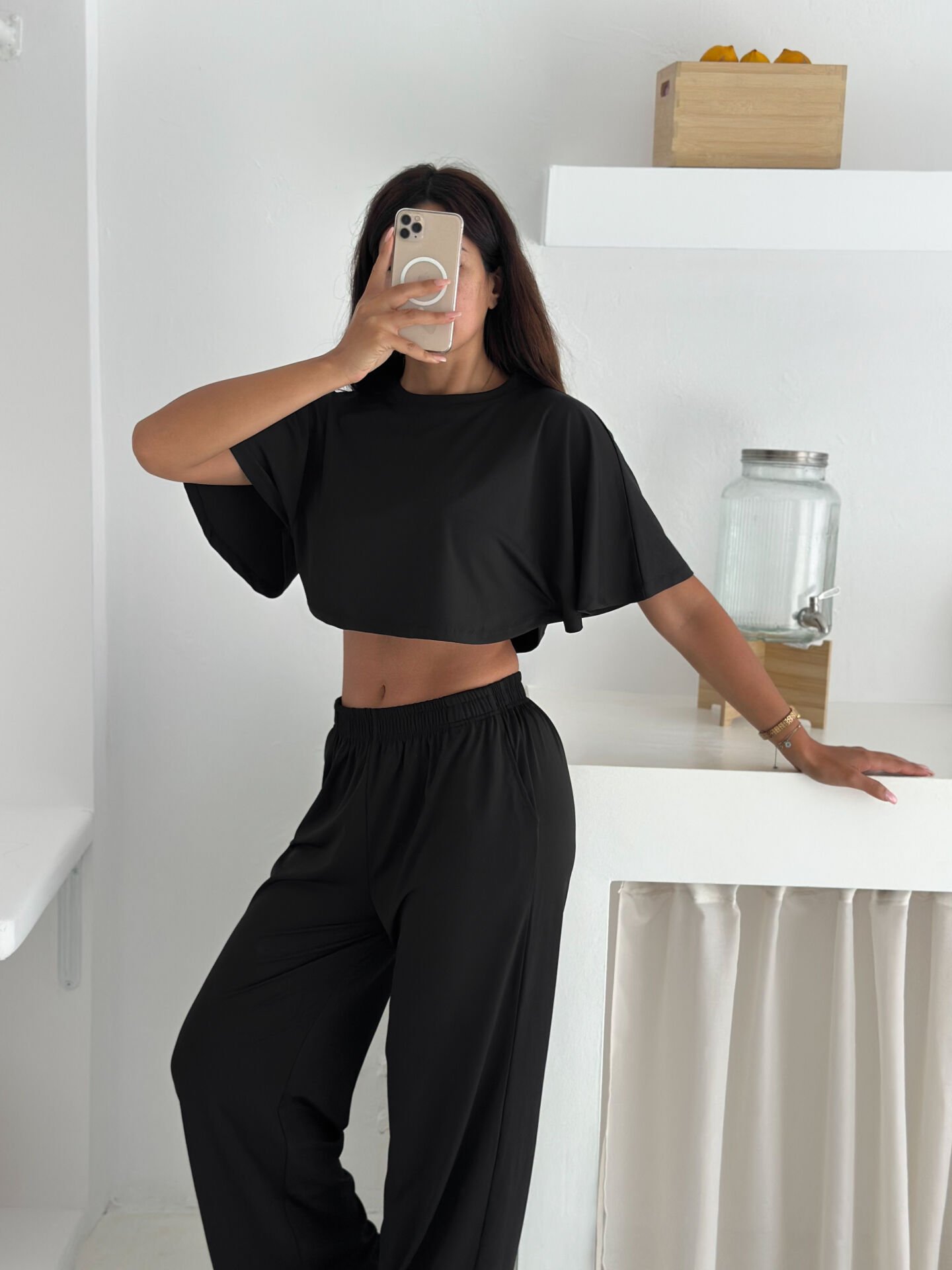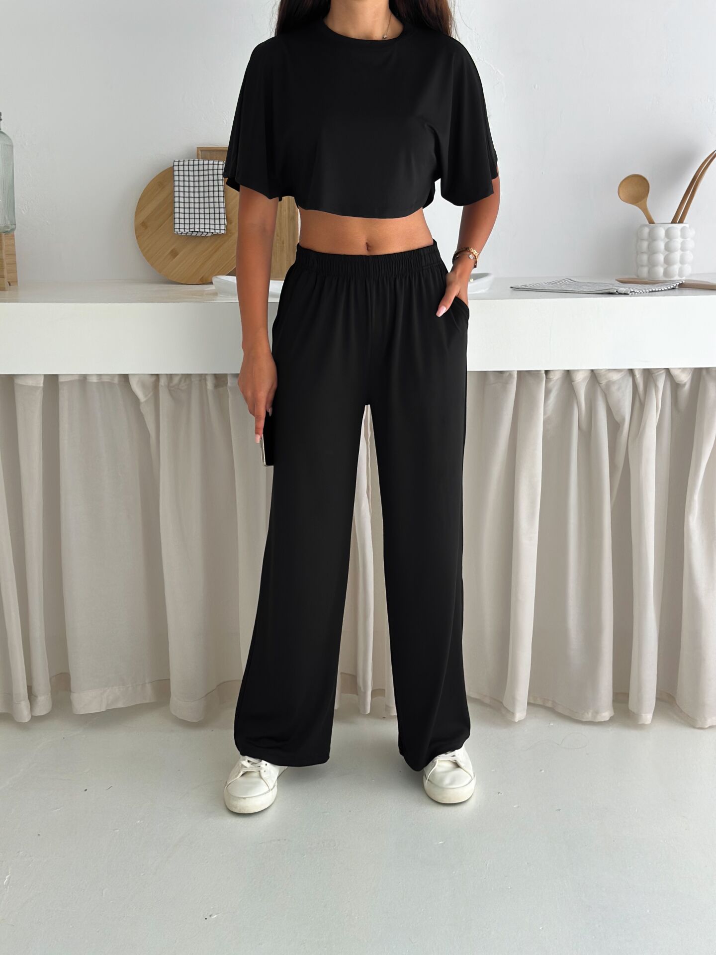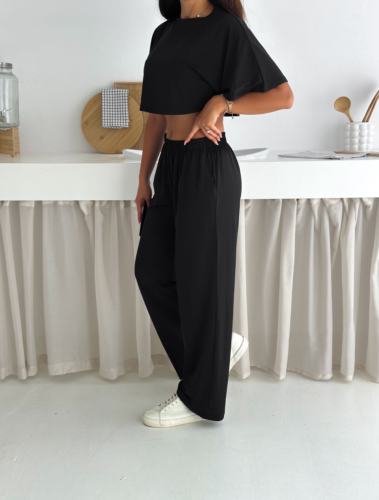 Yumuşacık dokulu ve likralı kadın günlük takım, yaz sıcaklarında maksimum konfor sunmak için tasarlanmıştır. Üst parçası yarasa kol geniş bluzdan, alt parçası ise cepli baggy kesim pantolondan oluşur. %90 Polyester – %10 Likra karışımı kumaşı sayesinde esnek, hafif ve ferah bir kullanım sağlar. Geniş paça formu modern bir siluet sunarken bisiklet yaka detayı sade ve şık bir görünüm oluşturur. Astarsız ve baskısız yapısı sayesinde günlük kullanım için ideal olup Cool & Comfort persona ruhunu yansıtır. Kemersiz yapısı rahatlığı artırır; yüksek beli ile duruşu toparlayarak zarif bir görünüm sunar. Tek parça paket içeriği sayesinde pratik bir alışveriş deneyimi sağlar. Yaz sezonuna özel renk ve dokularla Winmoda tarafından üretilmiştir.