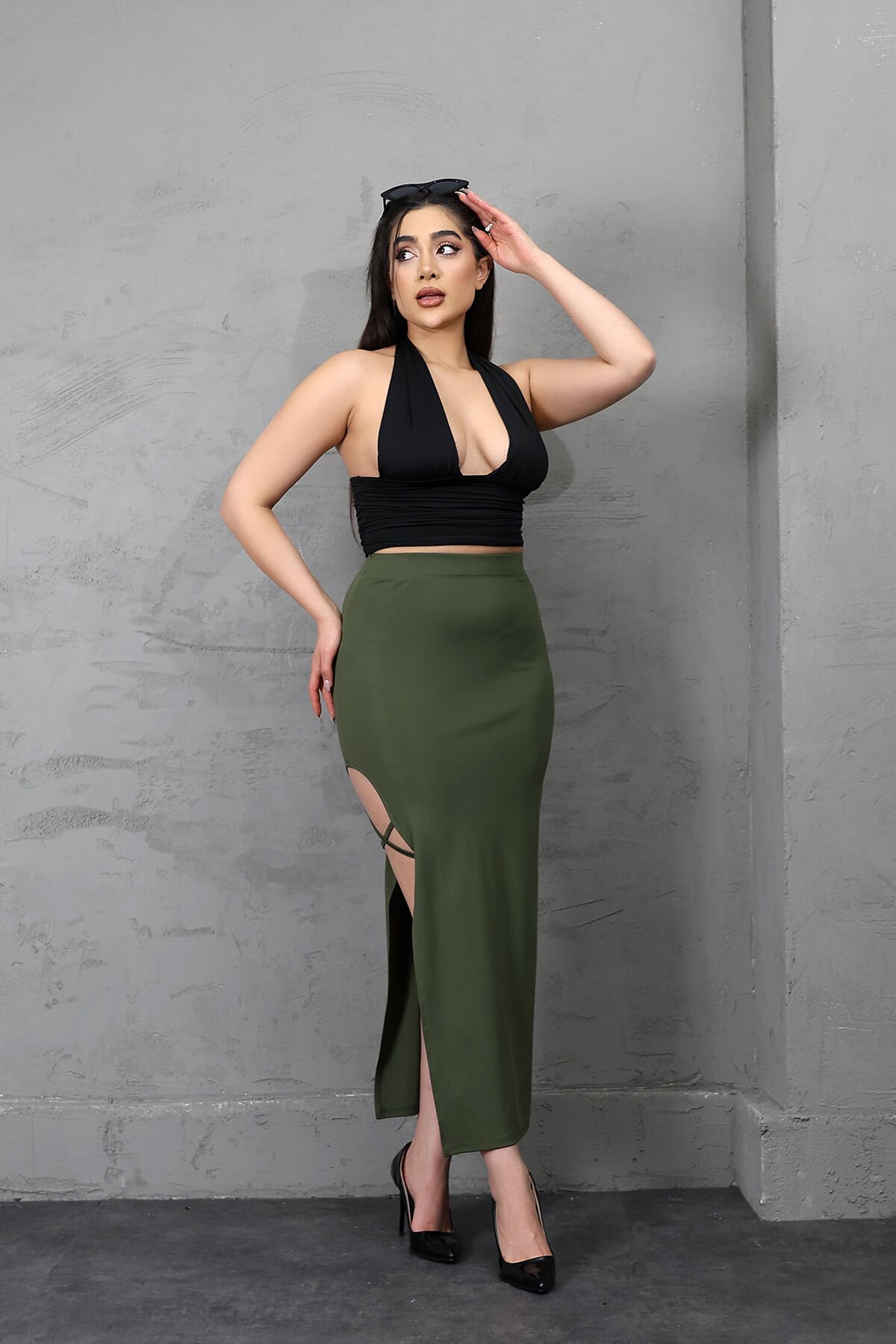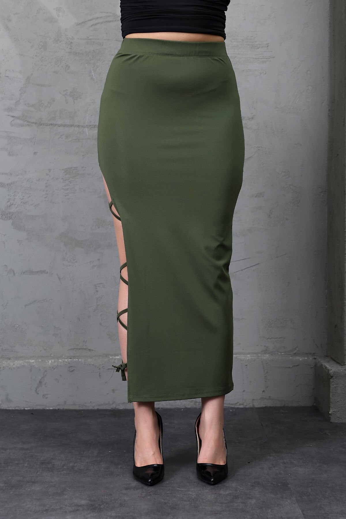 Kadın Uzun Kordon Bağlamalı Yırtmaçlı Likralı Maxi Etek E36 2XL - HAKİ