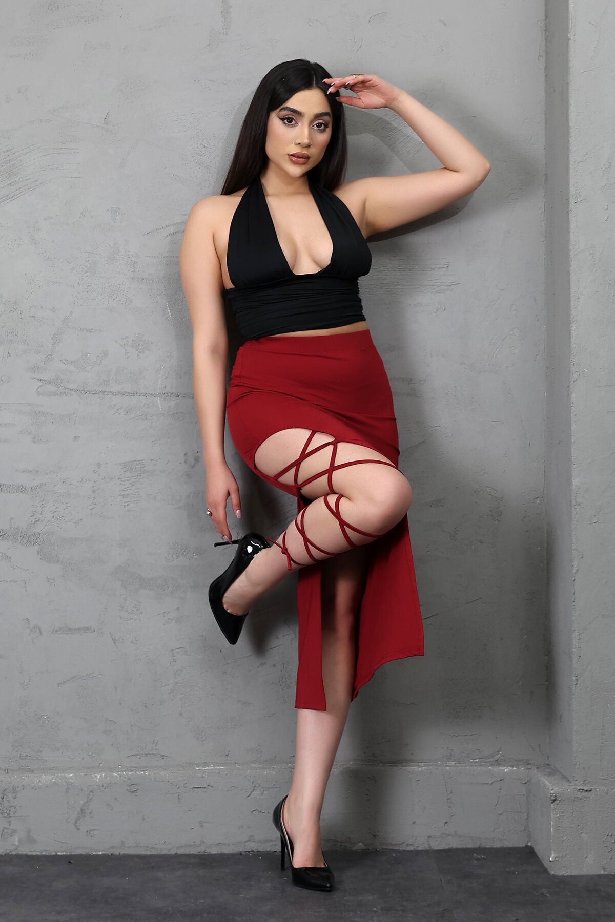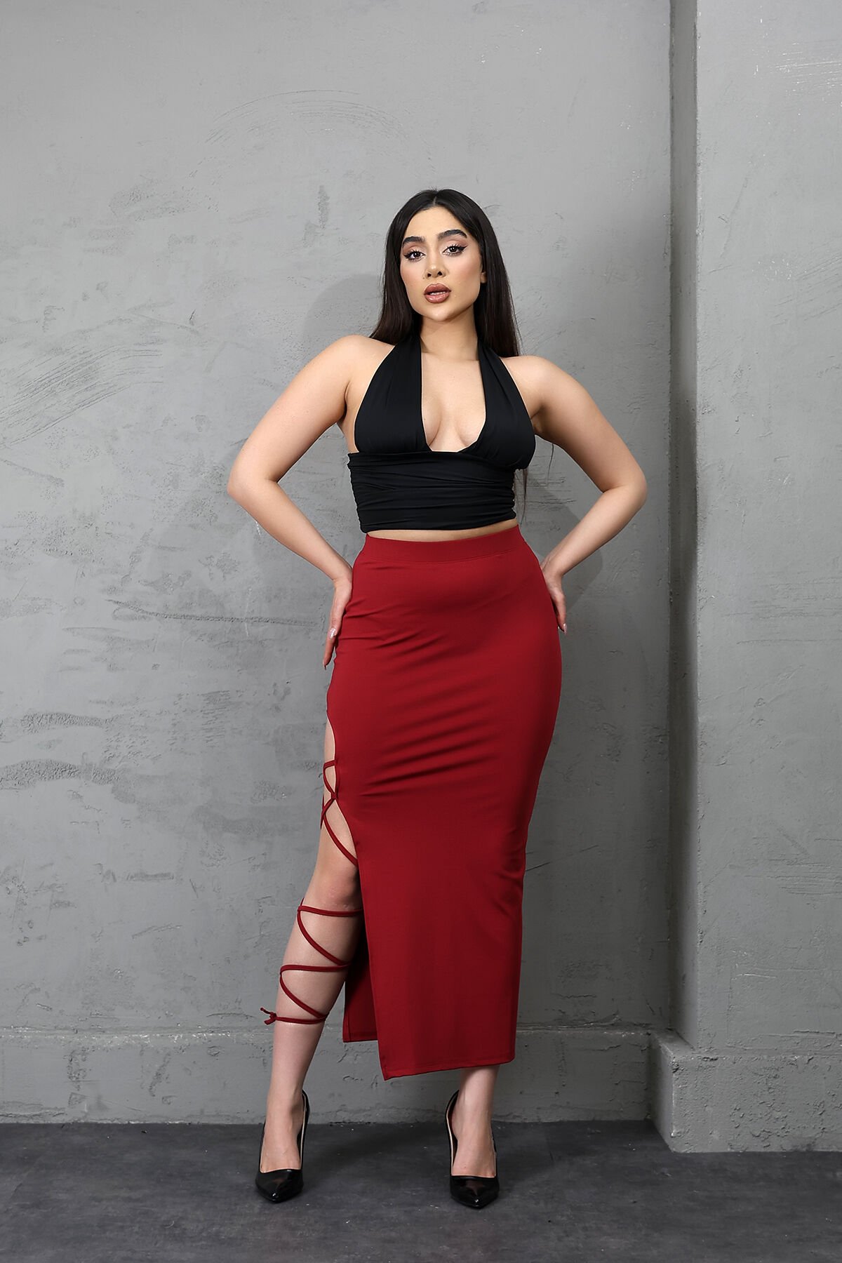 Kadın Uzun Kordon Bağlamalı Yırtmaçlı Likralı Maxi Etek E36 L - BORDO