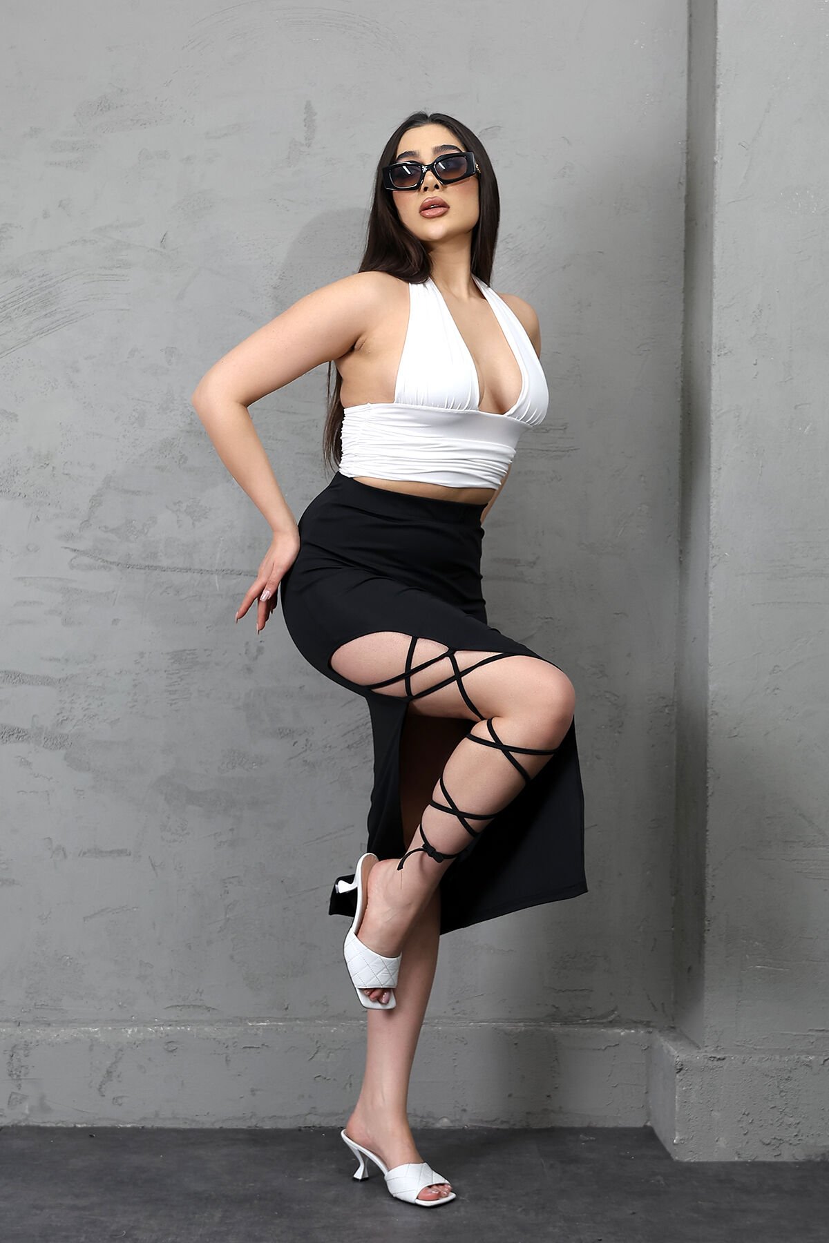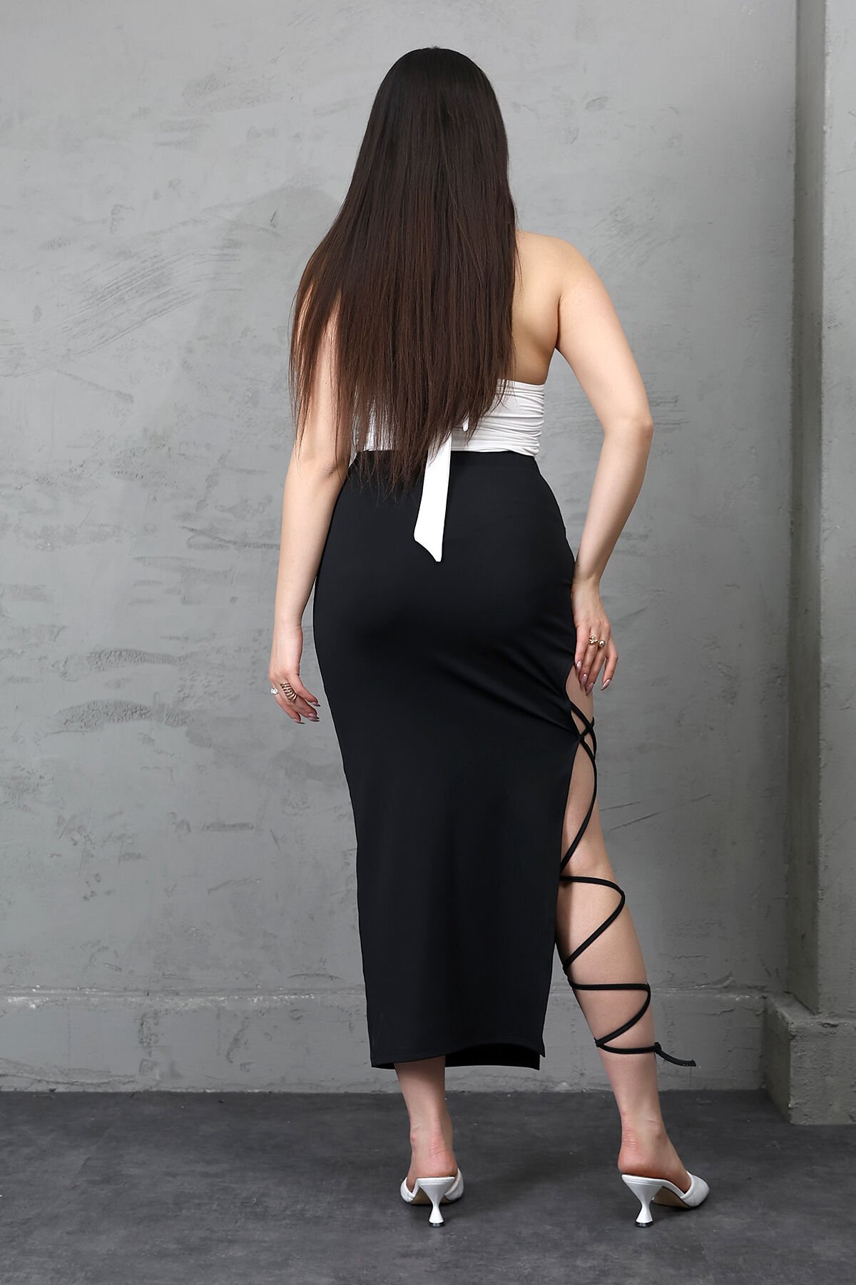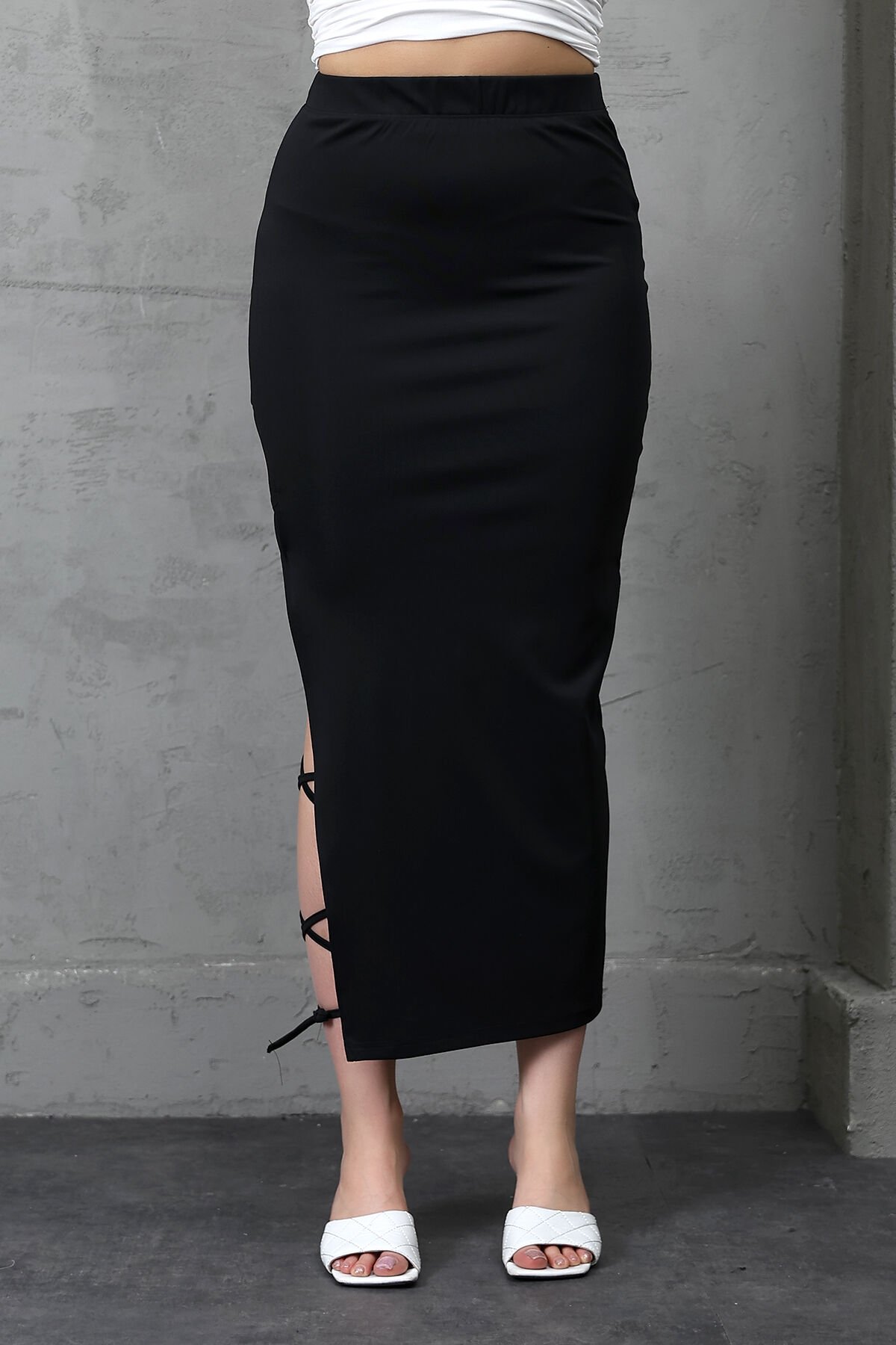Kadın Uzun Kordon Bağlamalı Yırtmaçlı Likralı Maxi Etek E36 L - SİYAH