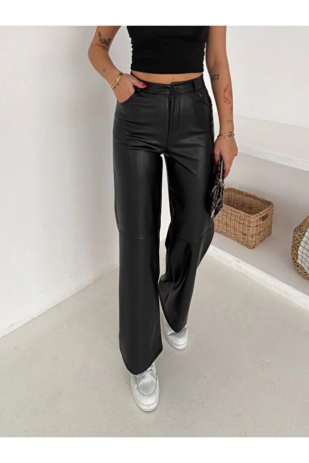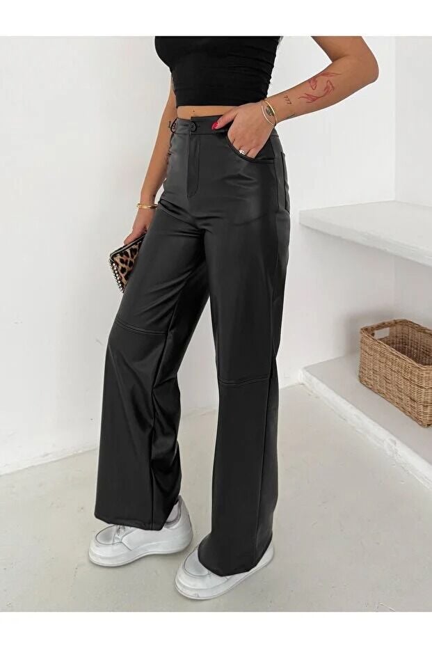 Kadın Yüksek Bel Geniş Paça Siyah Suni Deri Pantolon - Arka Cepli 2598 M - SİYAH