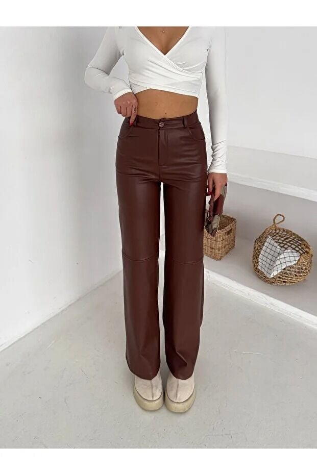 Kadın Yüksek Bel Geniş Paça Siyah Suni Deri Pantolon - Arka Cepli 2598 S - KAHVERENGİ